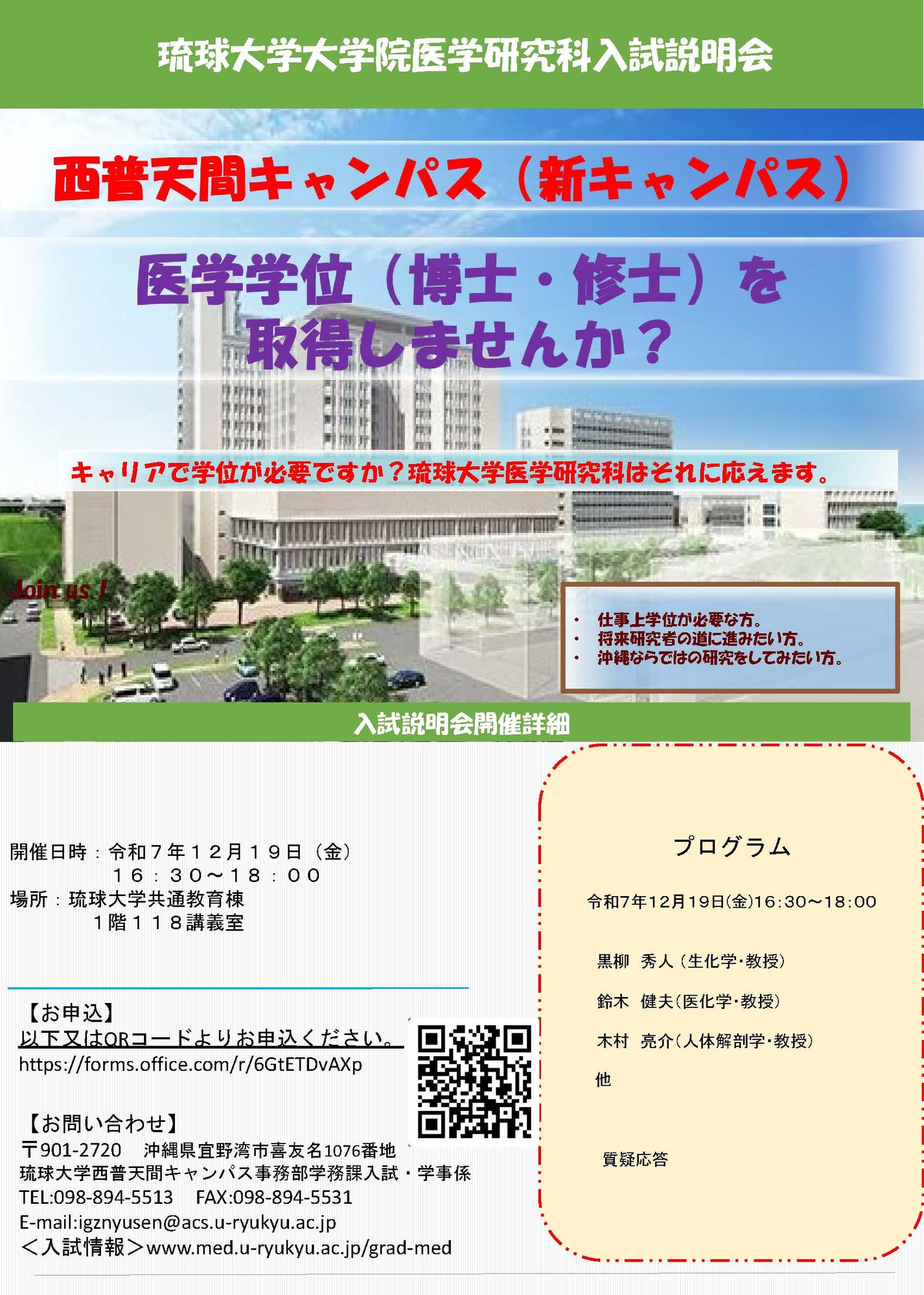 琉球大学千原キャンパスで、大学院医学研究科入試説明会が開催されます