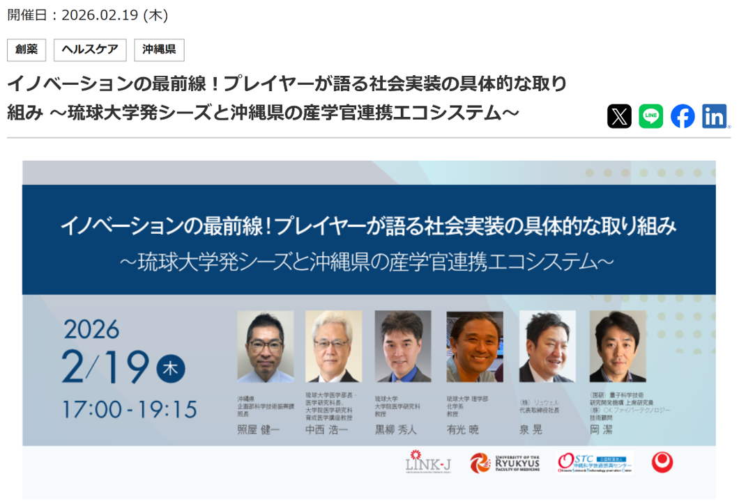 2026年2月19日(木)に東京都中央区の日本橋ライフサイエンスハブで開催される一般社団法人ライフサイエンス・イノベーション・ネットワーク・ジャパン(LINK-J)のイベント「イノベーションの最前線!プレイヤーが語る社会実装の具体的な取り組み ~琉球大学発シーズと沖縄県の産学官連携エコシステム~」で、黒柳秀人教授が「病態形成過程を抑制する革新的な拡張型心筋症治療薬の開発」のタイトルで研究成果を紹介します。
